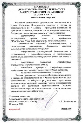 Згодна з вышэйпазначыным дакументам органы дзяржаўнага будаўнічага нагляду не ўключаны ў пералік кантрольных (наглядных) органаў, упаўнаважаных праводзіць праверкі. Кантрольныя (наглядныя) мерапрыемствы інспекцыі маюць прафілактычную і папераджальную накіраванасць і праводзяцца ў форме мерапрыемстваў тэхнічнага (тэхналагічнага, паверачнага) характэру.