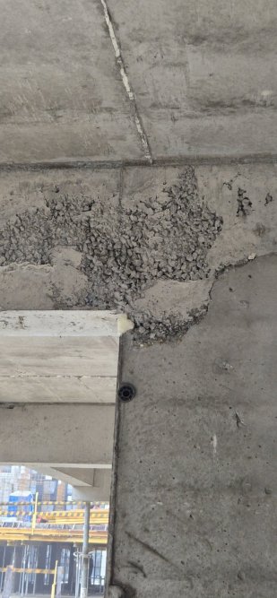 Нарушение: вследствие нарушения технологии производства работ по бетонированию строительных конструкций на бетонных поверхностях имеются участки неуплотненного бетона (монолитные конструкции отм. +0.000-+7.200, секция 1 и 4), чем нарушены требования п. 7.10.6 СН 1.03.01-2019 «Возведение строительных конструкций зданий и сооружений».