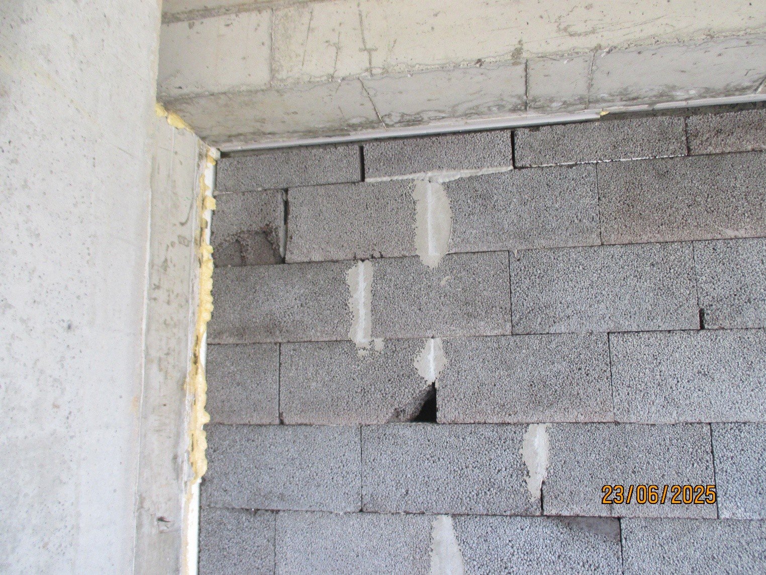 Нарушение: вследствие нарушения технологии производства работ при выполнении кладки из мелких блоков на клеевых смесях толщина швов между блоками – превышает 3 мм, чем нарушены требования п. 5.4.4 СН 1.03.01-2019 «Возведение строительных конструкций зданий и сооружений».