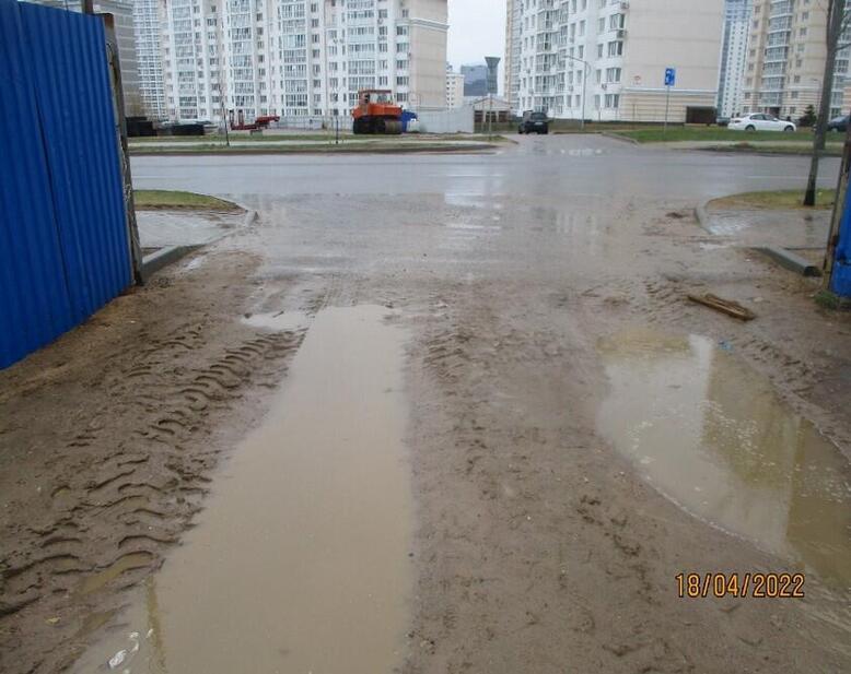 В нарушение пункта 4.13 СН 1.03.04-2020 «Организация строительного производства» строительная площадка не оборудована пунктом мойки колес автотранспорта, в результате чего грунт выносится на территорию проезжей части.