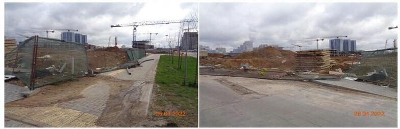 В нарушение пункта 4.13 СН 1.03.04-2020 «Организация строительного производства» ограждение строительной площадки имеет разрывы, деформировано, не выполнены козырьки в местах прохода людей, не выполнено устройство пункта мойки колес автотранспорта.
