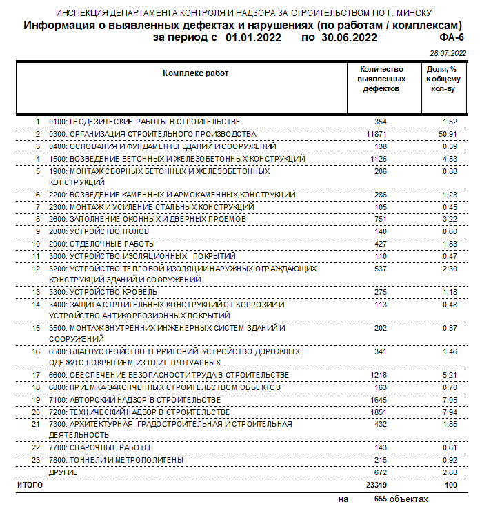 За I полугодие 2022 года в г. Минске инспекцией в ходе выполнения контрольных (надзорных) функций было выявлено 23 319 дефектов и нарушений на 655 объектах.