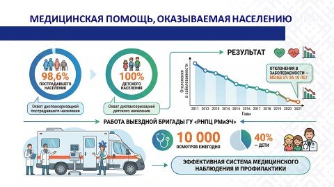 Первостепенное внимание уделяется здоровью населения. На систематической основе учреждениями здравоохранения Беларуси ежегодно проводится специальная диспансеризация населения. Выстроена многоуровневая система оказания медицинской помощи, включающая организации здравоохранения районного, городского, областного уровней. Действует система учета граждан, пострадавших от катастрофы на ЧАЭС и других радиационных аварий, в виде Государственного регистра.