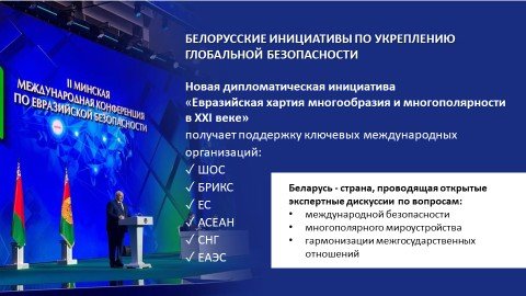 В современных условиях повестка мира является всеобщей.  Беларусь является площадкой для открытых, конструктивных дискуссий на тему международной безопасности. Ежегодно проводятся минские конференции по евразийской безопасности (прошедшие в октябре 2023 г. и октябре–ноябре 2024 г.) с участием знаковых международных политиков, которые ведут честный разговор и дают беспристрастные оценки происходящим событиям. Цель – достижение мира и согласия на внешнем контуре. Проведение данного мероприятия планируется и в 2025 году.
