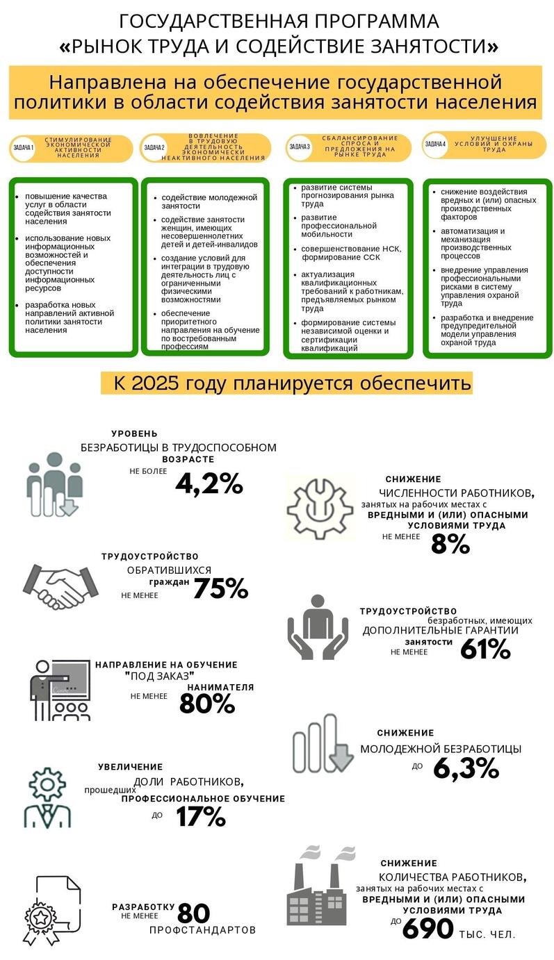 В Республике Беларусь 30 декабря 2020 года постановлением Совета Министров Республики Беларусь № 777 утверждена Государственная программа «Рынок труда и содействие занятости» на 2021 – 2025 годы, которая обеспечивает преемственность целей и направлений социально-экономического развития государства, ориентиров развития социально-трудовой сферы предыдущего пятилетия.