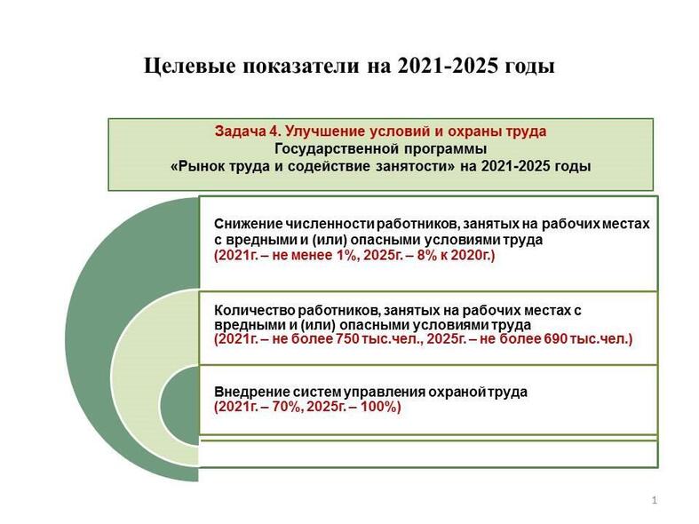 В результате принимаемых мер, направленных на улучшение условий и охраны труда, планируется 2025 году снизить численность работников, занятых на рабочих местах с вредными и (или) опасными условиями труда, в организациях не менее чем на 8 процентов к уровню 2020 года.