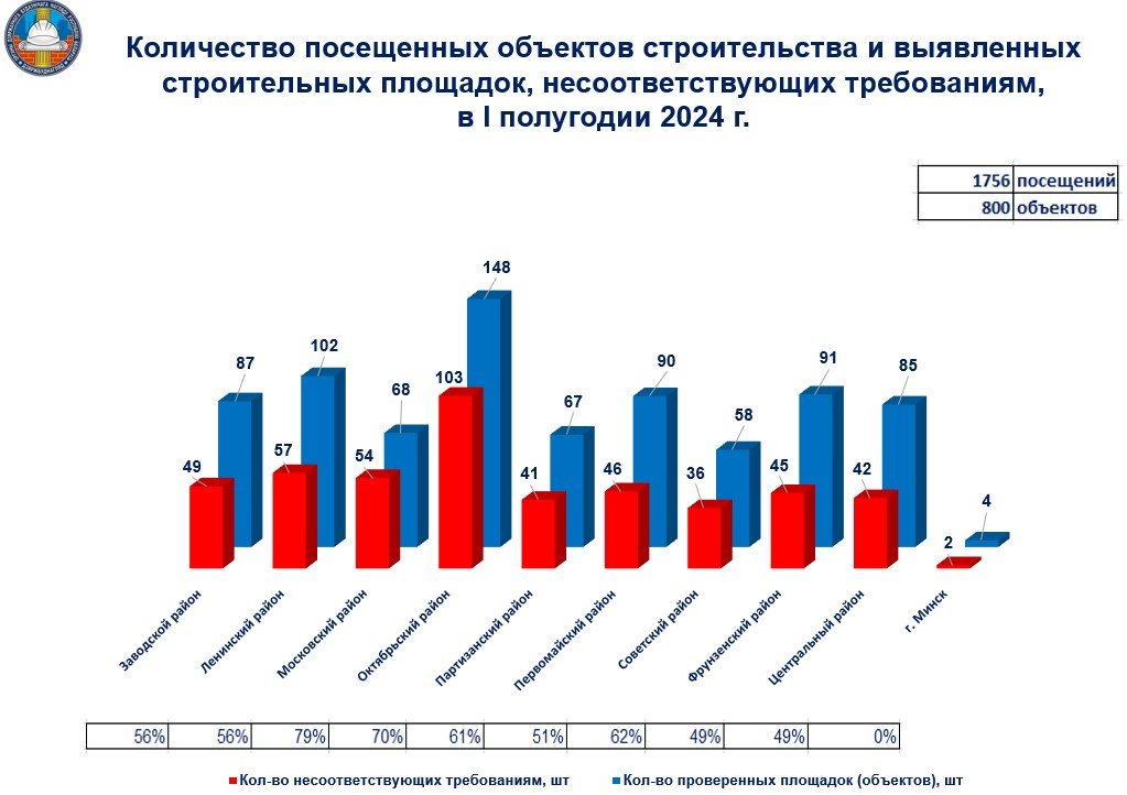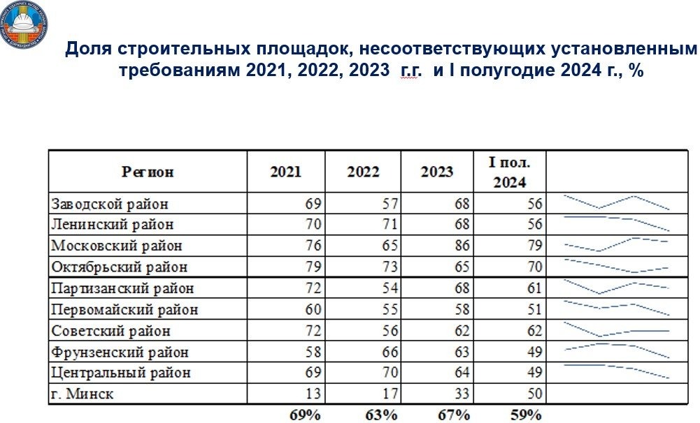 Руководитель инспекции доложила о количестве проверенных инспекцией строительных площадок и удельном весе тех, которые не соответствуют установленным требованиям с разбивкой по каждому району г. Минска с учетом динамики с 2021 года и за 1 полугодие 2024 года.