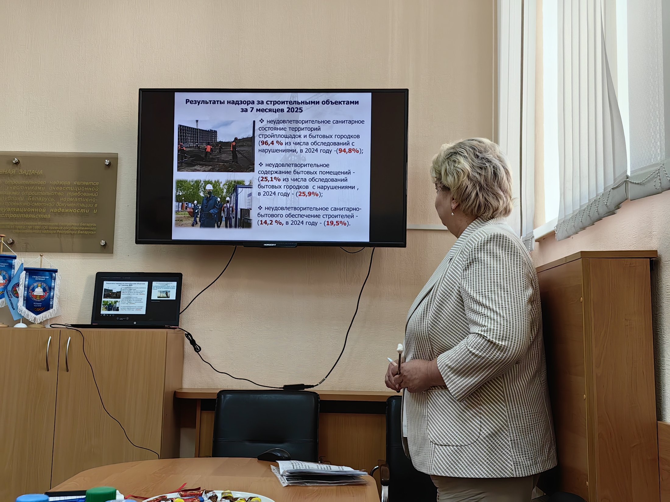 В ходе семинара слушатели ознакомились с результатами санитарного надзора на объектах строительства г. Минска за 7 месяцев 2025 г., количестве выданных предписаний, рекомендаций, примененных мер ответственности.