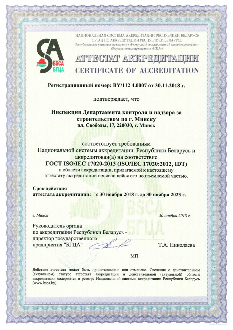 Инспекция Департамента контроля и надзора за строительством по городу Минску 30 ноября 2018г. прошла подтверждение компетентности и аккредитована на соответствие требованиям Национальной системы аккредитации Республики Беларусь ГОСТ ISO/IEC 17020-2013 в качестве инспекционного органа типа А.