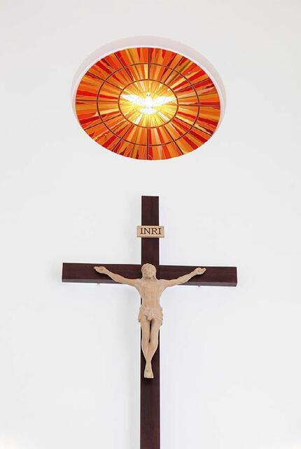 Внешний вид молитвенного зала совмещает в себе объёмы неоготики и оформление интерьера в стиле минимализма. В аписдной части костёла установлен деревянный крест с распятием. Над ним круглый витраж (1,70 см. в диаметре) с изображением голубя. Голубь в христианской иконографии — символ Святого Духа. Как раз Святому Духу костёл и посвящен. Кстати, внешний вид витража вдохновлен таковым в Соборе Святого Петра в Риме.