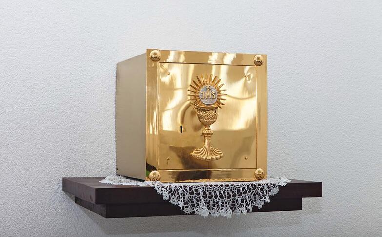 Под крестом располагается небольшой позолоченный табернакль (дарохранительница) — место, где хранятся Святые Дары. Композицию завершают гранитные главный алтарь (где совершается Евхаристия) и амвон (трибуна, с которой читают Божье слово и проповедь). И алтарь, и амвон изготовили умельцы из числа прихожан храма.