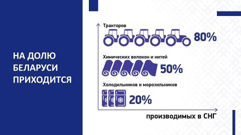 На долю Беларуси приходится около 80% производимых в СНГ тракторов, около 50% химических волокон и нитей, пятая часть холодильников и морозильников.