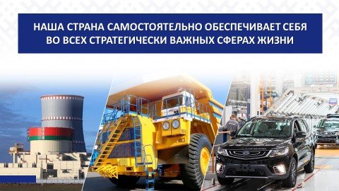Наша страна самостоятельно обеспечивает себя во всех стратегически важных сферах жизни. Под руководством Главы государства удалось не только сохранить и модернизировать наши промышленные гиганты (МАЗ, БЕЛАЗ, МТЗ, БМЗ и многие другие), но и создать совершенно новые, высокотехнологичные предприятия (Белорусская атомная электростанция, Китайско-Белорусский индустриальный парк «Великий камень», завод «БЕЛДЖИ», Белорусская национальная биотехнологическая корпорация и другие знаковые объекты). Это означает, что созданы сотни тысяч рабочих мест, обеспечены экономическая независимость страны и ее политический суверенитет.